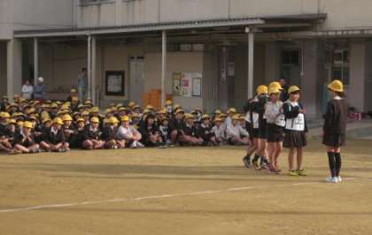 今回の児童集会は運動場で「勝ち抜きじゃんけんゲーム」でした。6年生が各ゲートのラインに立ち、たて割り班で列車を組んで進んできたチームとじゃんけんをします。勝てば次へすすんでいきます。はじめに集会委員会の人が1・2・3・4・5年生役になりみんなに見本をみせて、はじめてのゲームの説明をしました。