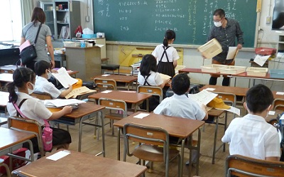 2・4・6年生の登校日でした。3つのグループに分かれての分散登校です。検温チェックの後、人と人との間隔をあけて運動場に集合し、新担任の話を聞きました。久しぶりに友だちと会って楽しそうな様子でした。
