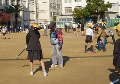 地域の人たちを招いて5年生が土曜参観に「グラウンドゴルフ」を教えていただきました。あたたかい陽気の中初めて体験するゴルフを熱心に話を聞いて取り組んでいました。手取り足取りていねいに教えてもらい、うれしそうに楽しんで取り組みました。
