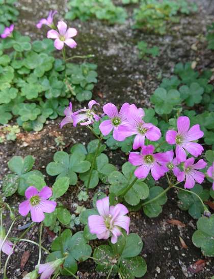 下の写真が「ムラサキカタバミ」のいう名前のようです。日ごろ何となく目に入っていた草花の名前を調べると、それぞれに名前があり、名前が判ると何となく親しみを持てるかもしれませんね。
