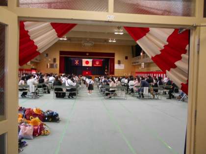 にゅうがくしきでは、たくさんの おうちのひとが きてくれて、きんちょうしながらも きらきらした えがおの 1ねんせいでした。