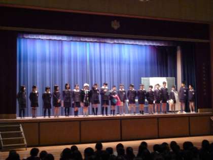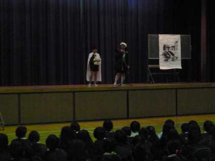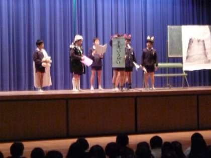 保健委員会の発表は、クイズを交えながらの劇です。裏山に住む物知りお婆さんを中心にかぜをひかない強い身体をつくるにはどうしたらよいのかを考えていくお話です。最後に「手洗い、うがいをこまめにする」「好き嫌いをせずに何でも食べる」「規則正しい生活をする」のことばでまとめて、みんなに呼びかけていました。笑もあり楽しく観賞していました。