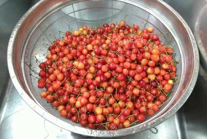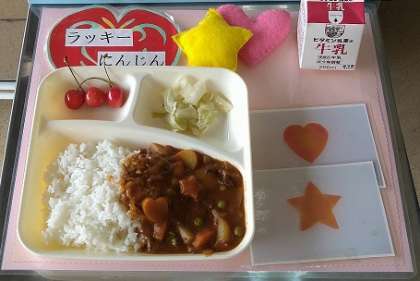 給食のハヤシライスは、小麦粉を褐色になるまで十分にいためた手作りのルウを使います。塩、こしょう、ローレル、デミグラスソース、トンカツソース、ウスターソースで味つけして、コトコト煮こんで作りました。給食調理員が、にんじんを型抜きして、ハートや星の形にしたものを、たくさん入れました。子ども達が食べるときに楽しく見つけて、喜んでいました。旬の生のさくらんぼもおいしいと好評でした。