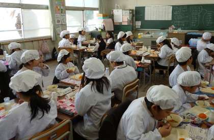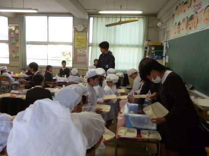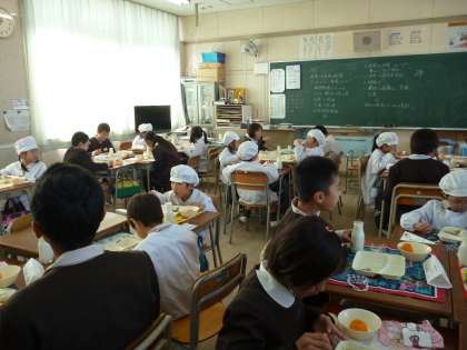 1年生と6年生、2年生と4年生、3年生と5年生が楽しく食事をしながら交流し、好ましい人間関係を築く良い機会をもちました。上級生が下級生を助けながら配膳・片づけをしたり、食事後簡単なリクレーションで楽しませてくれたりして交流がが深まったようです。