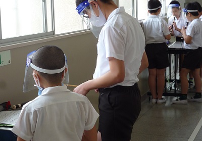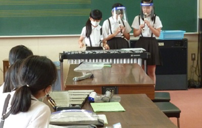感染症対策で一人一人に配られた『フェイスシールド』をして短い曲つくりをしています。子どもたちのなじみのある毎日聞く『チャイムの音』を基にしてリズムや音の長さ、音の高さ、反復など少しずつアレンジしていき、きれいな響きを作り出します。グループで話し合って熱心に作り上げていました。最後には、クラスのみんなに披露しました。