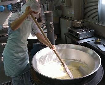 給食のシチューは、バターや油をあたためて、弱火で小麦粉が色がつかないように、じっくりいためて、ルウを作ります。スイートコーン(クリーム缶)を入れたので、黄色くなりました。じゃがいももホクホクにやわらかく、おいしく煮こみました。きゅうりのバジルもさわやかで、子ども達は喜んで食べていました。