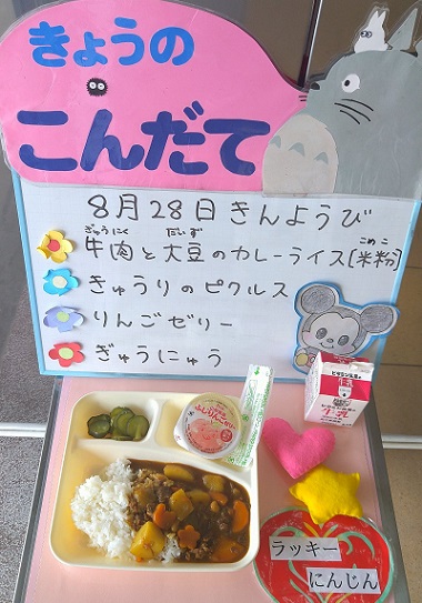 8月〜10月の給食のカレーライスは、米粉のカレールウの素を使用します。給食調理員が、カレーライスのにんじんを、お花とクマの形に型抜きして、ラッキーにんじんとして、釜に入れて混ぜ、コトコト煮こみました。子ども達は楽しんで、にんじんも大豆も、ホクホクのじゃがいもも、「おいしい!」とパクパク食べていました。