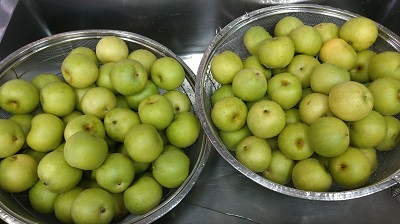 9月になると、給食にも、秋の食材が登場します。今回は、なし(二十世紀)です。給食室前に、なしの芯と皮を展示して紹介しました。「甘くておいしい」「なし大好き」と、子ども達に好評でした。