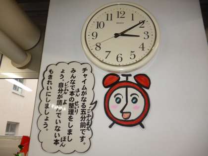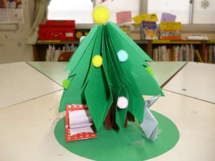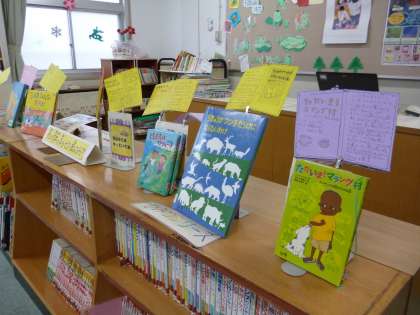12月の季節を盛り込んだ掲示物を飾っています。おすすめの本の紹介や図書室での利用のしかたなども掲示して、子どもたちが進んで読書するよう工夫しています。図書ボランティさんの制作していただいたかわいいクリスマスツリーもデスクに飾っています。