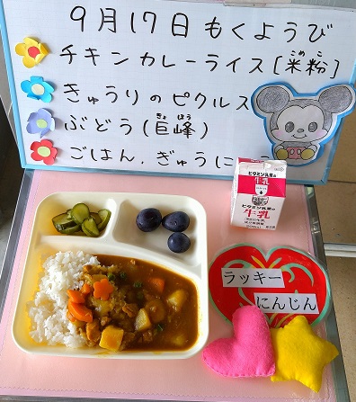 9月の給食のカレーライスは、米粉のカレールウの素を使用しています。給食調理員が、ラッキーにんじんを作って、お花の形に型抜きしたにんじんを、たくさん入れました。子ども達はクラスで見つけて喜んでいました。
