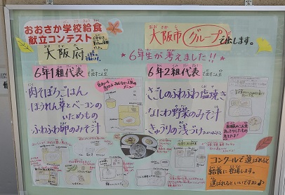 毎年、6年生は、夏休みの宿題で、献立を考えて、大阪府の学校給食献立コンクールに出しています。今年も子どもたちの楽しい作品が出そろいました。その中から、大阪市のコンクールにも、みんなで選んだものを出します。給食室の前に掲示して、他の学年に紹介しています。