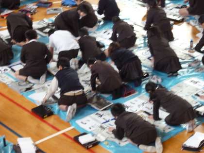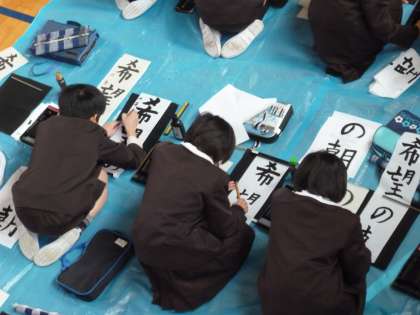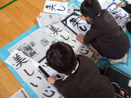 5・6年生が合同で書き初めをしました。5年は「美しい心」、6年は「希望の朝」を書きました。いつもと違い、たて長の半紙を講堂の床におき、のびのびと書いていました。清書した作品を並べて友だちの文字を鑑賞しました。