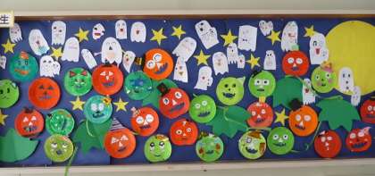 10月の玄関掲示は、3年生の作品「ハロウィン」。