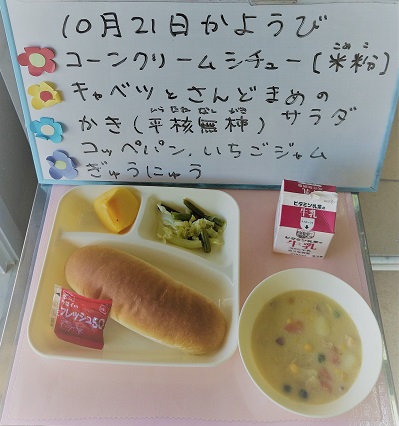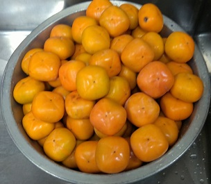 給食に、今年も柿が出ました。和歌山県産の平核無柿です。1人1/4切れずつでした。給食調理員が食べやすいように、へたをとり、皮をむいてくれました。秋を感じながら、子ども達はおいしく食べていました。