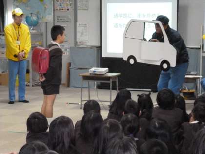 土曜授業で4年生が「防犯教室」を開き不審者への対応の仕方を学習しました。「危ない目やこわい目にあわないように自分の身は自分で守ろう。」をテーマに不審者に声をかけられたら「大声でにげる」「こども110番の家に逃げ込む」などの体験をしました。また、クラス対抗で大声の大きさ・逃げる動作を競うゲームもし、楽しく学習に取り組んでいました。