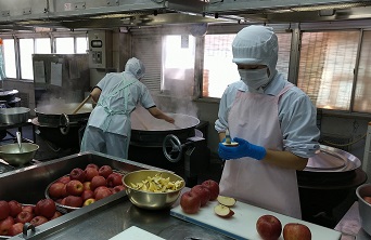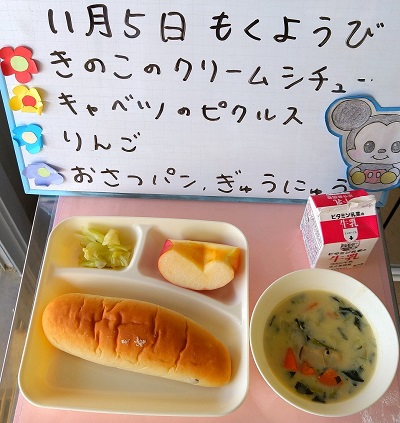 給食のクリームシチューのルウは、給食調理員が小麦粉をじっくりいためて作ります。きのこは、しめじ、エリンギ、マッシュルームの3種類を使いました。コトコト煮こんでできあがり。子ども達に「おいしい」と好評でした。りんごは青森県産の甘い「つがる」でした。