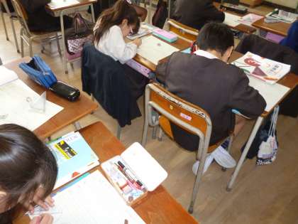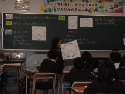円を使って二等辺三角形や正三角形を作図する学習です。それぞれの三角形の特徴をいかして考えていきます。考えたことをみんなの前で発表をしました。