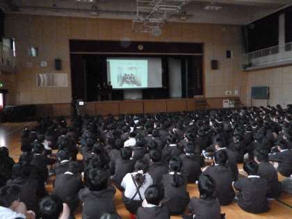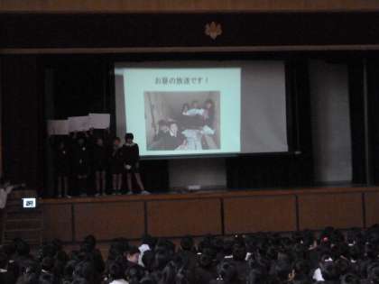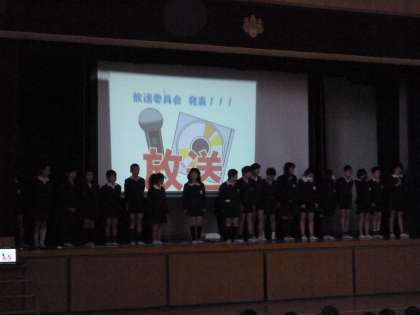 放送委員会の日常の活動のようすを発表しました。映像をまじえながらわかりやすく発表をしていました。クイズ形式のところもありみんなが参加でき、楽しい集会となりました。