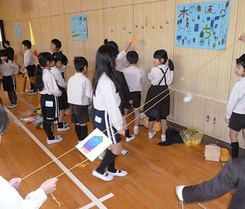 1・2年生の生活科の学習です。2年生が作った手づくりおもちゃを1年生がお客さんとなりいっしょに活動します。1年生は来年度2年生になったときの事前学習となり、2年生はリーダーシップを養うよい機会となります。1年間とおして活動した最後の交流活動でした。