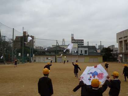 1年生活科「みんなであそうぼう」の単元で『冬の季節を生かして楽しく遊ぼう』のめあてをもって学習をしました。その中で凧揚げの凧に絵をかき、自分の凧を友だちと協力して運動場であげました。冷たい冬の風が吹く中、元気に走りまわりあがった凧に歓声をあげていました。