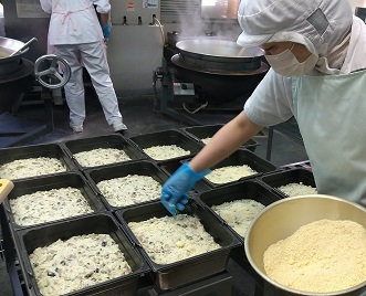 給食の「きのこのドリア」は、しめじ、マッシュルーム、エリンギを使用し、ベーコンでうまみを、クリームでコクを出しています。粉末チーズとパン粉を混ぜ合わせたものをふりかけて、焼きもの機でこんがりと焼きました。子ども達に「おいしい」と好評でした。