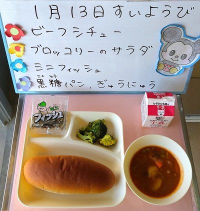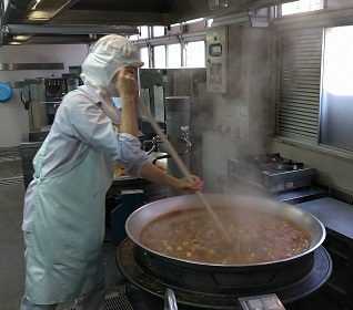 給食のビーフシチューは、牛肉を主材に、給食調理員が小麦粉と綿実油で作ったブラウンルウでコトコト煮こみます。今回も、子ども達においしいと好評でした。