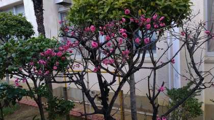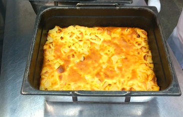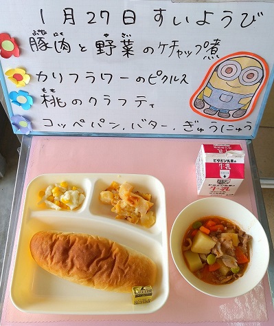 給食の「桃のクラフティ」は、フランスの家庭料理の焼き菓子を参考にして作ります。ミニバットに、コーンフレークを敷き、小麦粉、砂糖、卵、クリーム、桃(缶)を混ぜ合わせた生地を流し入れて、こんがり焼きました。子ども達に「おいしい」と好評でした。