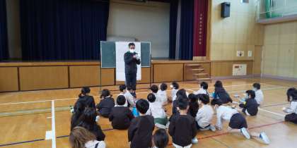 1年生のプログラミングがくしゅう「みちじゅんをかんがえて ポイントをまわろう」を講堂(こうどう)でおこないました。