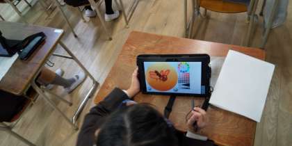 タブレットの画面に絵を描き、アプリの機能を駆使して動きのある画像を作成します。