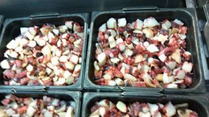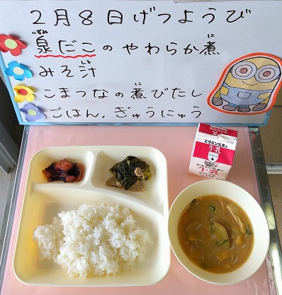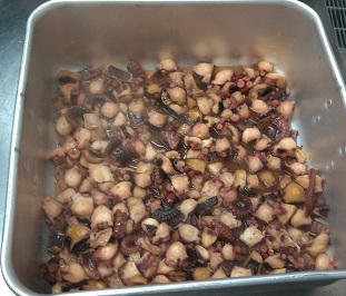大阪府農林水産物学校給食提供事業により、大阪湾でとれた泉たこを使用した献立が登場しました。たこは砂糖、料理酒、みりん、しょうゆといっしょにミニバットに入れて、焼きもの機で約90分煮ました。子ども達には「おいしい」「味が濃い」「やわらかい」と好評で、よくかんで食べていました。(写真は、煮る前とできあがり後のたこです。)
