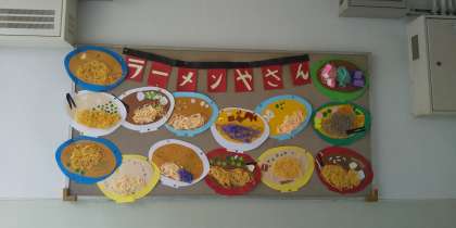 なかよしタイムで工作をしました。今日のテーマはラーメン屋さんです。まず、色画用紙でラーメンの鉢とスープを作ります。毛糸をもじゃもじゃに貼って麺を表現します。ネギやチャーシューなど好きな具材をハサミで切って上手に作りました。味噌ラーメンや白湯スープ、いろんな味のラーメンが完成しました。一番人気はしょうゆラ—メンでした。