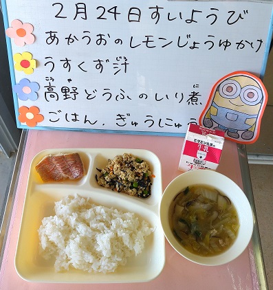 給食にも、いろいろな魚が登場します。なかでも「あかうお」は、子ども達に人気があります。今回は、あかうおに塩をふって、スチームオーブンで、こんがりと焼きました。そして、料理酒、みりん、しょうゆを合わせ、和歌山県産のレモンをしぼった汁を入れて煮た、給食調理員の手作りのたれをかけています。ごはんが進むおかずがいっぱいでした。