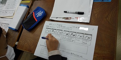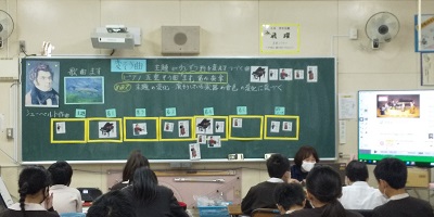 「変奏曲を楽しもう」の学習で『ピアノ五重奏 ます 第4楽章』を聴き、主題が少しずつ形を変えて演奏されていくことに気付いていきました。きれいな分かりやすいメロディの主題の変化や演奏されている楽器の変化をとらえていました。自分のお気に入りの部分を選び、理由や感想を鑑賞カードに書き込んでいました。自分なりに感じた感想が多く書かれていて、楽しく取り組んでいたようすがうかがえました。次回は、その感想をもとに話し合い、曲全体のながれの変化に気付きながら鑑賞していきます。