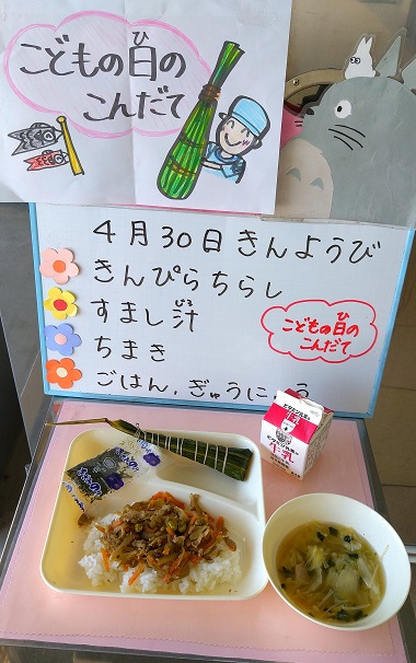 給食室前の掲示板で、給食を紹介しています。「きんぴらちらし」は、きんぴらとご飯を混ぜて、きざみのりをかけて食べます。「ちまき」は、新潟県の工場で、熟練の職人が笹巻きをしてくれています。大阪市独自に、糖分を控えて作ってもらっています。1年生にたずねてみると、「初めて食べた」「おいしい」「おもち好き」「ひもをくるくる楽しかった」とのことです。