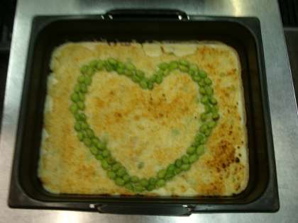 給食調理員がいつもたくさん食べてくれる6年生に心を込めてサプライズをしました。6年生のほたて貝のグラタンを、枝豆でハートの形に飾り付けをして、こんがり焼きました。教室では、ふたを開けてビックリ!6年生はとてもうれしそうでした!