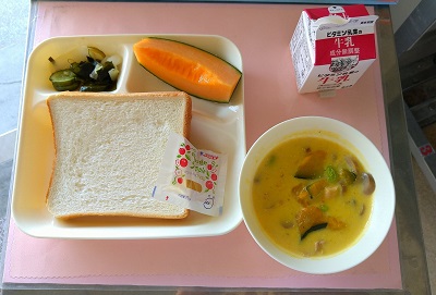 給食の6月に登場するクリームシチューは、給食調理員の手作りのルウと、かぼちゃをコトコト煮こみ、黄色く、甘みとコクもぐんと増しておいしいと好評でした。ミックス海草は、北海道のわかめや岩手県や宮城県の茎わかめやこんぶを使用したサラダです。そして、クインシーメロンは熊本県で作られたものが、約60個届きました。1人1/8切れです。子ども達は、いろいろなものを楽しく味わって食べていました。