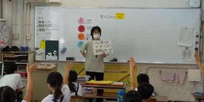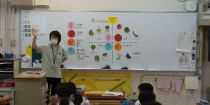 今週21日(月)の児童朝会で、校長先生から果物や野菜の「旬」についてお話がありましたが、今日は3年2組で本校の栄養教諭の先生から「旬のたべもの」について食育授業がありました。