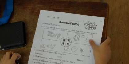 その次に12種類の食べものについて「旬」は春・夏・秋・冬のいずれかを考えました。各自でプリントに絵や文字で記入して、答え合わせをしました。今は季節に関係なくお店で売られている物も多いので、「旬」を知ることは難しかったようです。