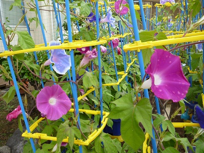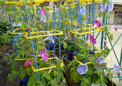 1年生があさがおの種を植えたときからぐんぐん成長し、つるが伸び、きれいな花を咲かせています。色とりどりの花でいっぱいです。