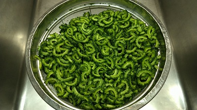 給食では、毎年7月に「ゴーヤチャンプルー」が出ます。ゴーヤは、給食調理員がしっかり水洗いして、中のタネやわたをていねいにとり、食べやすく切って、塩で下味をつけています。豚肉やもやしといっしょにいため、塩としょうゆで味つけし、子ども達が食べるときに、かつおぶしをかけます。「食べられたよ。」「苦いと思ったけど、大丈夫やった。」と味わって食べていましたよ。