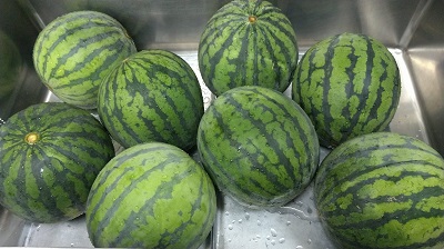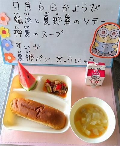 給食に、すいかは毎年7月に登場します。鳥取県産の大きなすいかが8玉届きました。1人1/64切れずつです。「甘い!」「おいしい!!」と好評でした。鶏肉と夏野菜のソテーも、赤ピーマンやきゅうりなどの夏野菜がおいしく、さわやかなさっぱりした味つけで、食べやすかったようです。