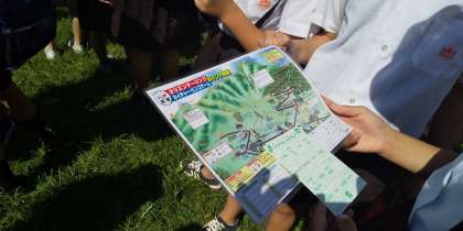 班ごとに地図とカードを持って、高原を歩いてチェックポイントを回ります。これはネイチャーゲームの一種で、五感を働かせて自然に対する理解を深める活動です。例えば良い匂いがするものを探し、全員がそう感じたらチェックポイントクリアです。
