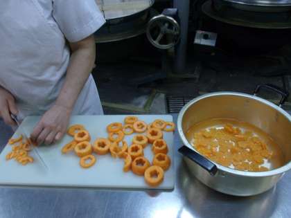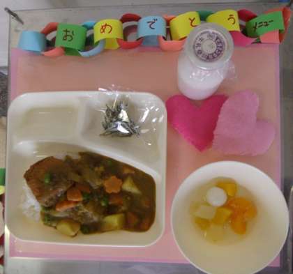 給食調理員が、カレーのにんじんを桜の花の形に型抜きして、各クラスに約5個ずつ入れて、ラッキーにんじんにしました。1年生も大喜びでした。