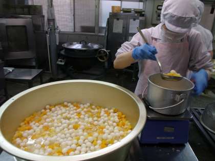 4月10日の給食は、カツカレーライス、フルーツ白玉、ミニフィッシュ、牛乳です。1年生の入学と、2〜6年生の進級をお祝いした献立です。
