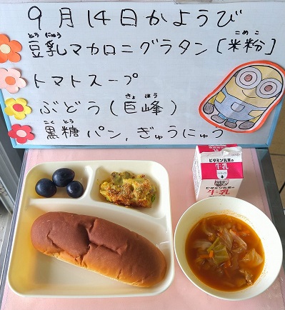 小麦粉と牛乳を使わないグラタンが登場しました。グラタンの材料はベーコン、たまねぎ、米粉のマカロニ、マッシュルーム、グリーンピースです。豆乳と米粉を混ぜ合わせて、とろみをつけています。米パン粉をふりかけて、カリカリとした食感を出し、カレー味がきいていました。子ども達は、長野県産のぶどう(巨峰)で秋を感じ、よくかんで、味わって食べていました。