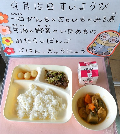 今年は9月21日(火)が十五夜です。十五夜が「芋名月」とも言われることもあり、給食にも、さといもを使用した煮ものやみたらしだんごが登場しました。給食調理員が、にんじんを星やお花、うさぎの形に型抜きして、ラッキーにんじんとして、たくさん入れました。子ども達は、よくかんで、モリモリ食べていました。