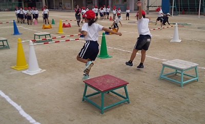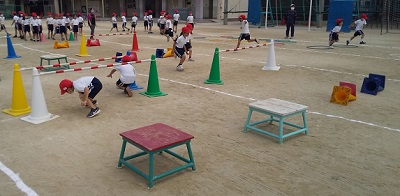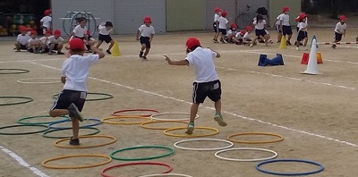 「多様な動きをつくる運動遊び」からフラフープやカラーコーン、ポートボール台、バーなどを使って、跳んだり走ったりくぐったりケンパしたりして、楽しそうに体つくりの運動に取り組んでいました。