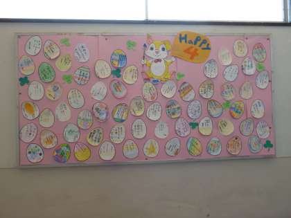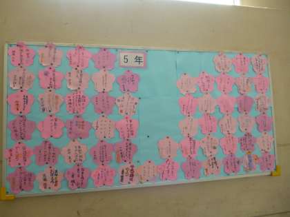 廊下掲示です。4年生5年生の子どもたちが今年度がんばりたいことをカードに書きました。