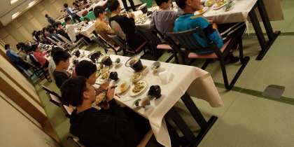 お腹もペコペコ、とっても楽しみにしていた夕食タイムです。淡路の名物尽くし、玉ねぎ、蛸メシ、淡路牛そうめん、鯛などなど「美味しい〜!」って、声には出せないけれど、みんなの満面の笑みが美味しさを物語っています。