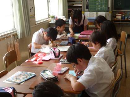 今年度の縦割り班のグループ編成をしました。自己紹介をして名札づくりをしました。どうすればよいのか困っている1年生にやさしく手助けする6年生の姿はとてもほほえましい光景でした。